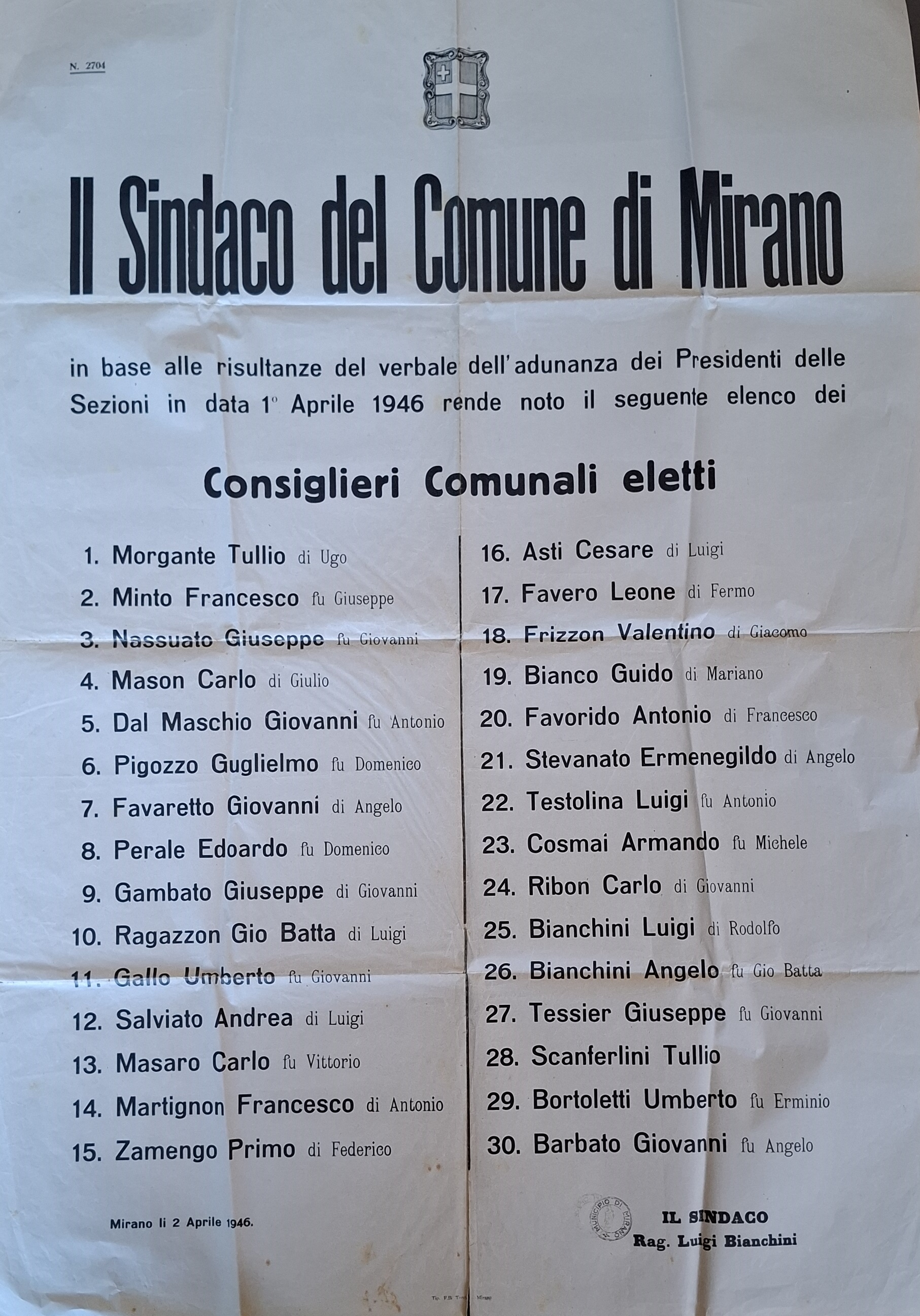 Nella foto, allegata sotto, il manifesto che rende noto l'elenco dei Consiglieri Comunali eletti, datato 2 aprile 1946 (dall'Archivio storico comunale).