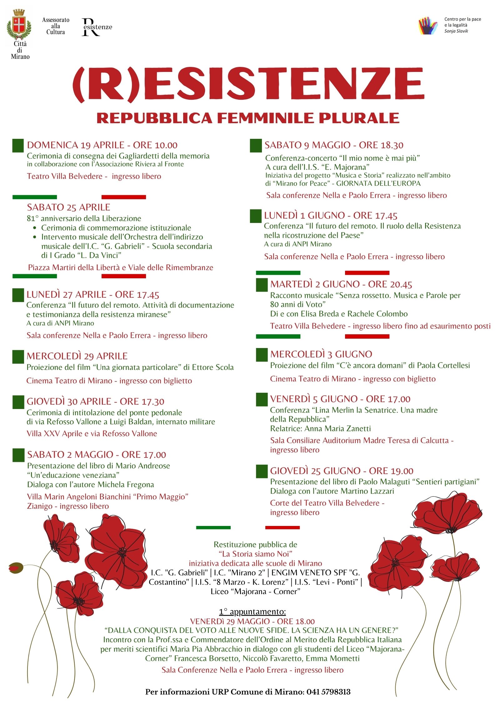 Il programma “(R)Esistenze” quest’anno è intitolato “Repubblica Femminile Plurale” perché all’81° anniversario della Liberazione si accompagnano le celebrazioni degli 80 anni dal primo voto politico nazionale delle donne in Italia (si svolse il 2 giugno 1946 insieme al referendum istituzionale monarchia-repubblica, anticipato dalle prime elezioni amministrative del dopoguerra che a Mirano si svolsero il 31 marzo 1946). Il suffragio femminile segna un passaggio storico che diede avvio al percorso che portò al ruolo fondamentale delle donne nella costruzione della Repubblica e alle successive profonde trasformazioni sul piano civile, sociale e democratico nel nostro Paese.