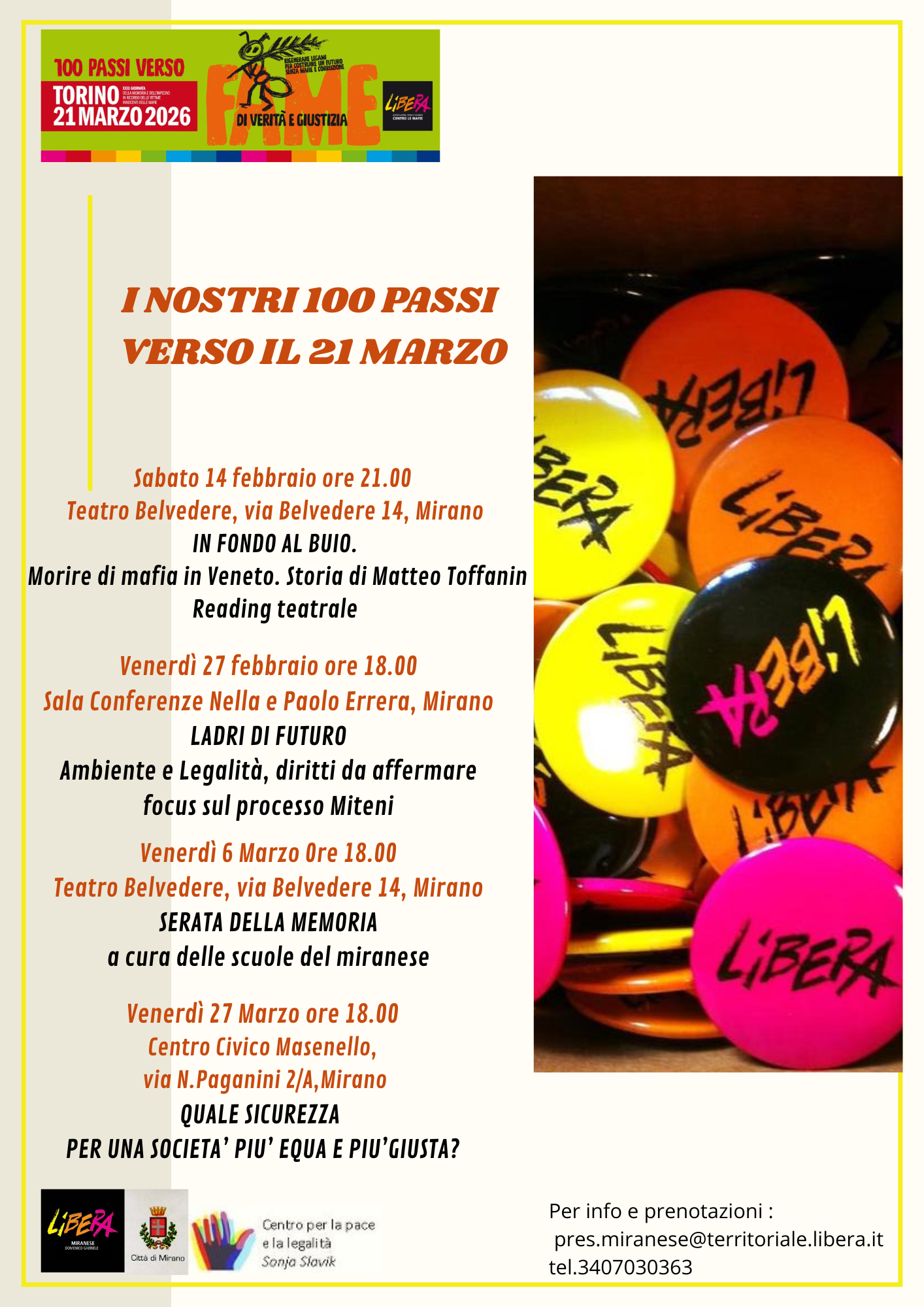 Per informazioni e prenotazioni: pres.miranese@territoriale.libera.it, tel. +39 3407040363