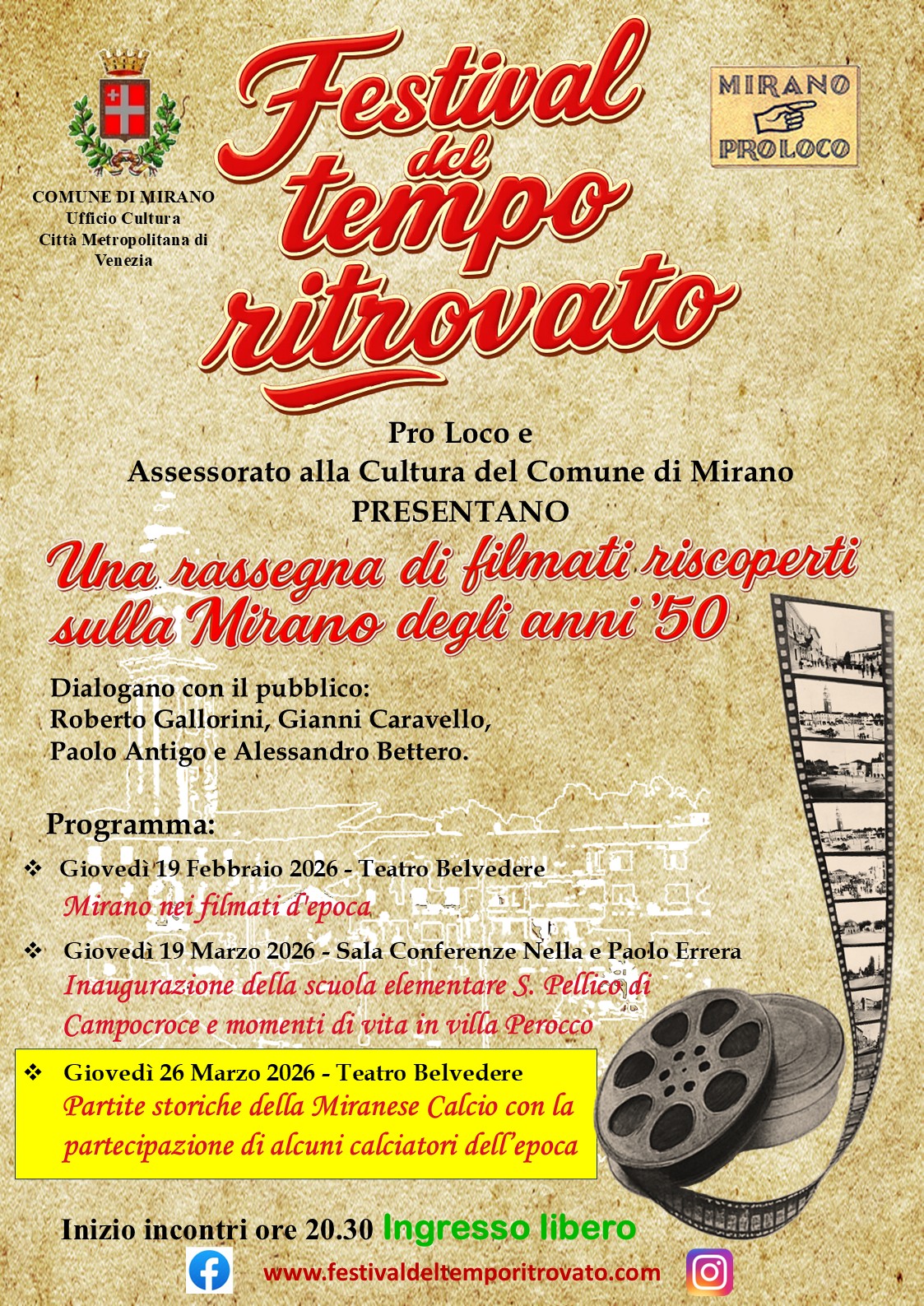 La Pro Loco Mirano invita al terzo e ultimo appuntamento con il “Festival del tempo ritrovato” alle ore 20.30 nel Teatro Belvedere. Saranno proiettati filmati delle “Partite storiche della Miranese Calcio”. Si vedranno alcuni incontri di calcio, in casa e in trasferta, della squadra della Miranese alla fine degli anni '50 del secolo scorso. La suggestione delle immagini del passato restituirà, con una punta di nostalgia, un emozionante capitolo della storia di Mirano. Non solo calcio, ma anche spettatori sugli spalti, scorci della città com'era e qualche vip di passaggio. Alla serata parteciperanno anche alcune vecchie glorie della Miranese che dialogheranno con il pubblico.
