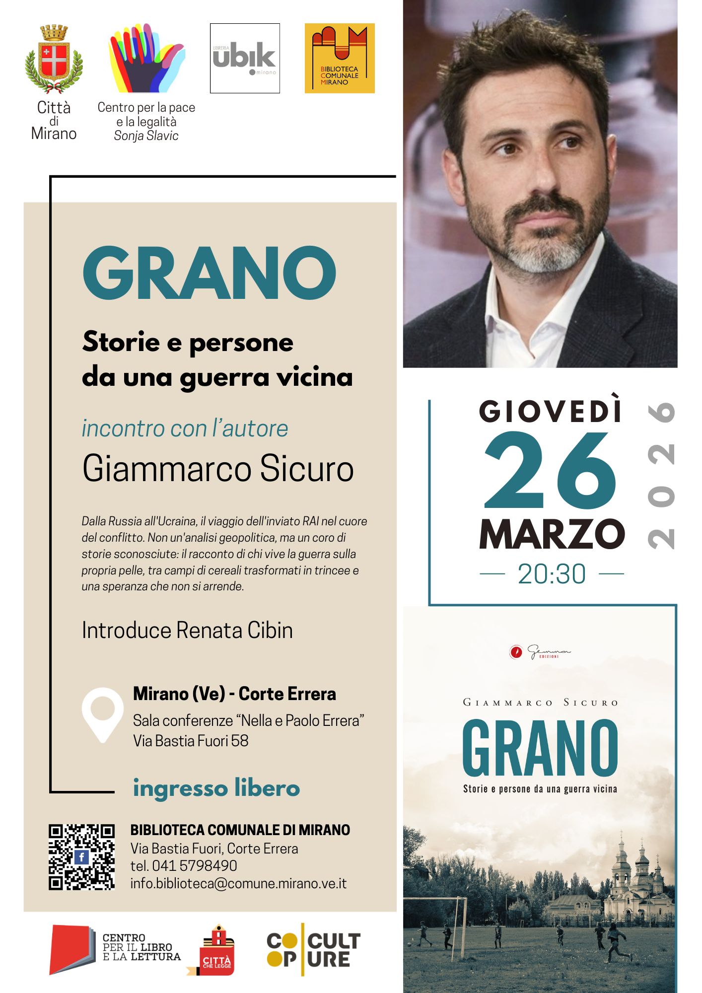 La Biblioteca comunale coordina la presentazione del libro “Grano. Storie e persone da una guerra vicina” e l’incontro con l’autore Gianmarco Sicuro alle ore 20.30 nella sala conferenze “Nella e Paolo Errera”. Introduce Renata Cibin. Ingresso libero fino ad esaurimento posti.