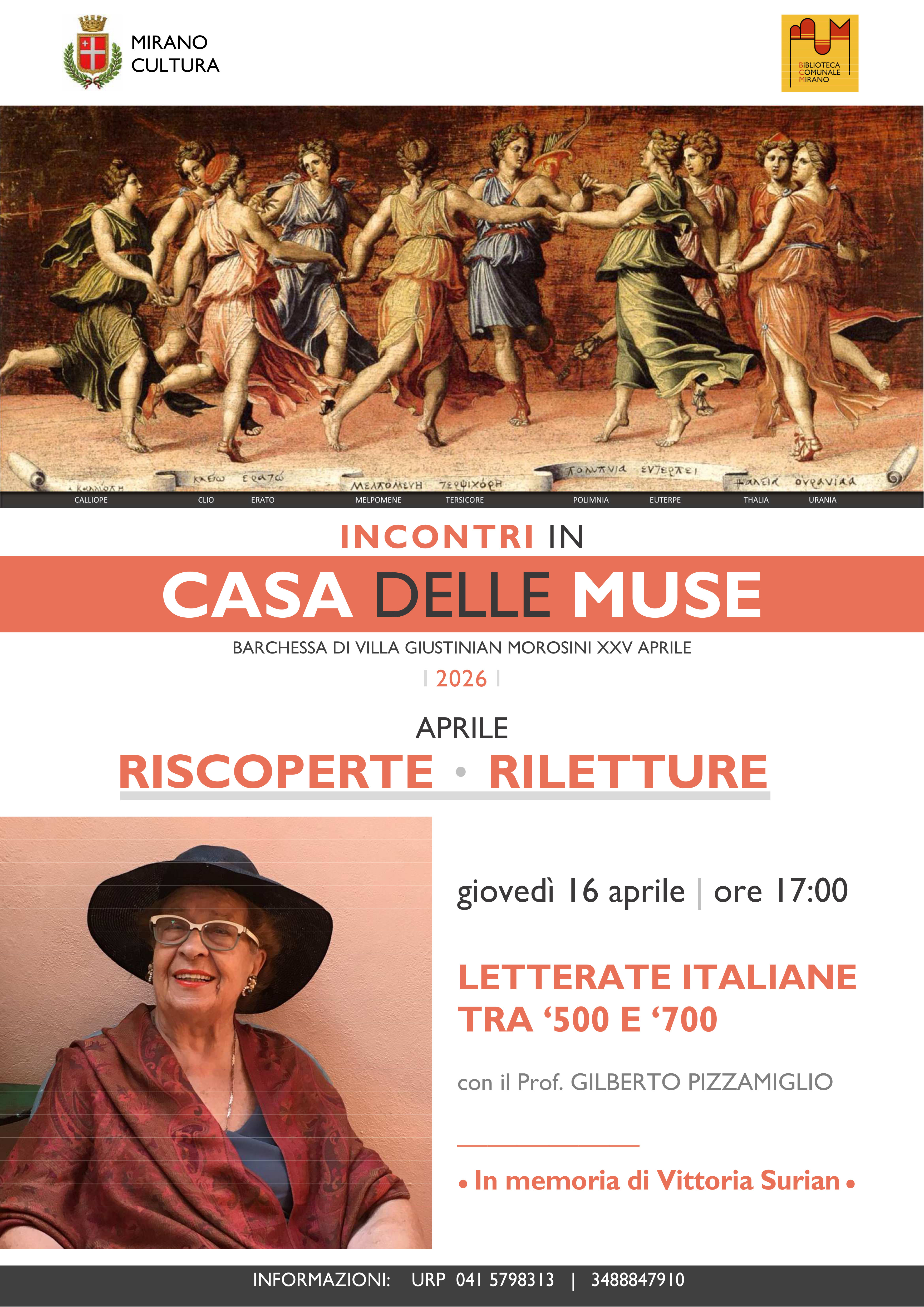 Oggi giovedì 16 aprile alle ore 17.00 incontro “In memoria di Vittoria Surian. Letterate italiane tra ‘500 e ‘700” con il professor Gilberto Pizzamiglio nella Casa delle Muse, presso la Barchessa Giustinian-Morosini “XXV Aprile” in via Mariutto n. 1 a Mirano.